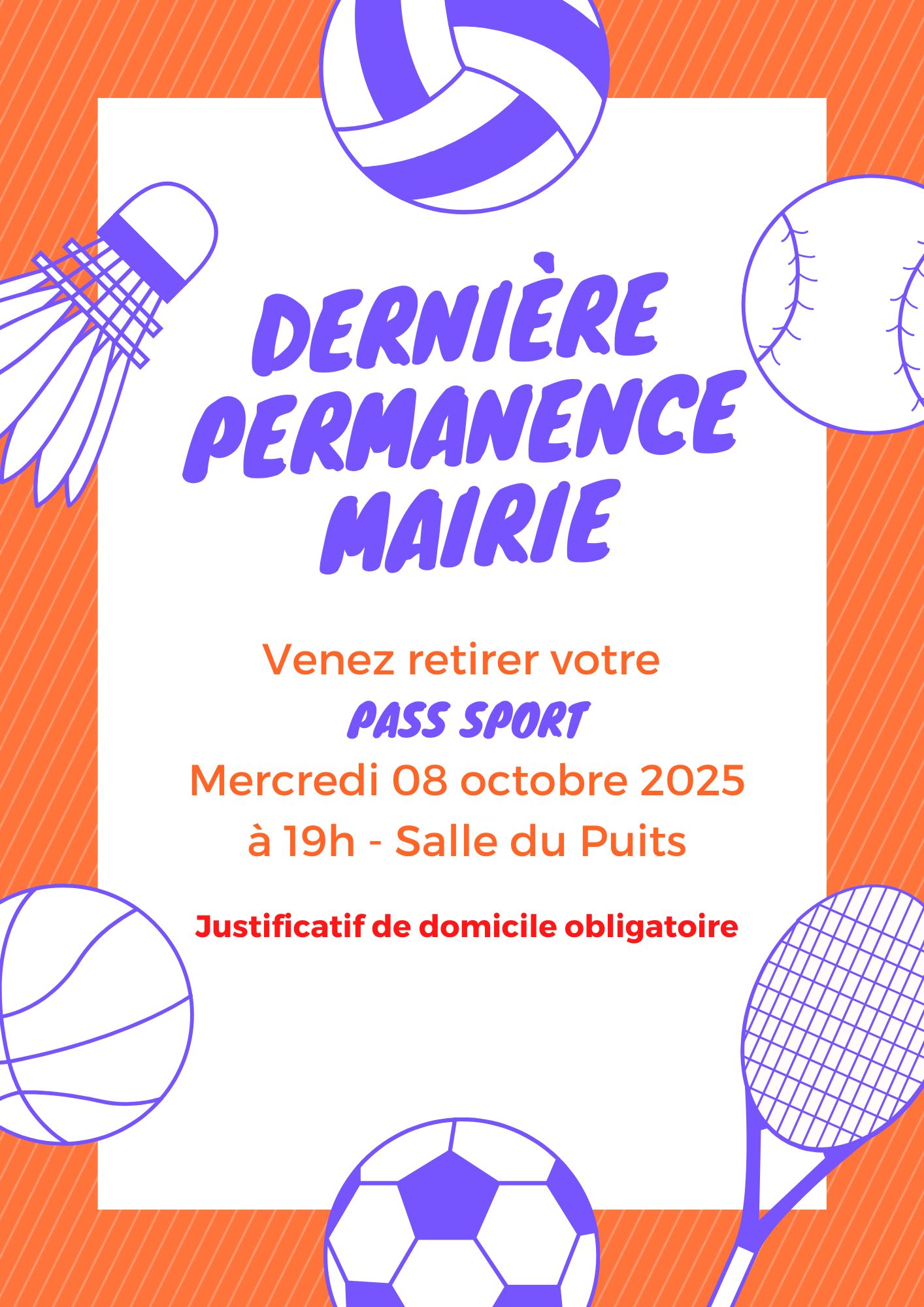 DERNIERE PERMANENCE PASS SPORT + Ajouter à mon Agenda Google + Exporter vers iCal Date 08 Oct 2025 Heure 19h00 - 20h00 Lieu Salle du Puits Salle du Puits Partagez cet événement
