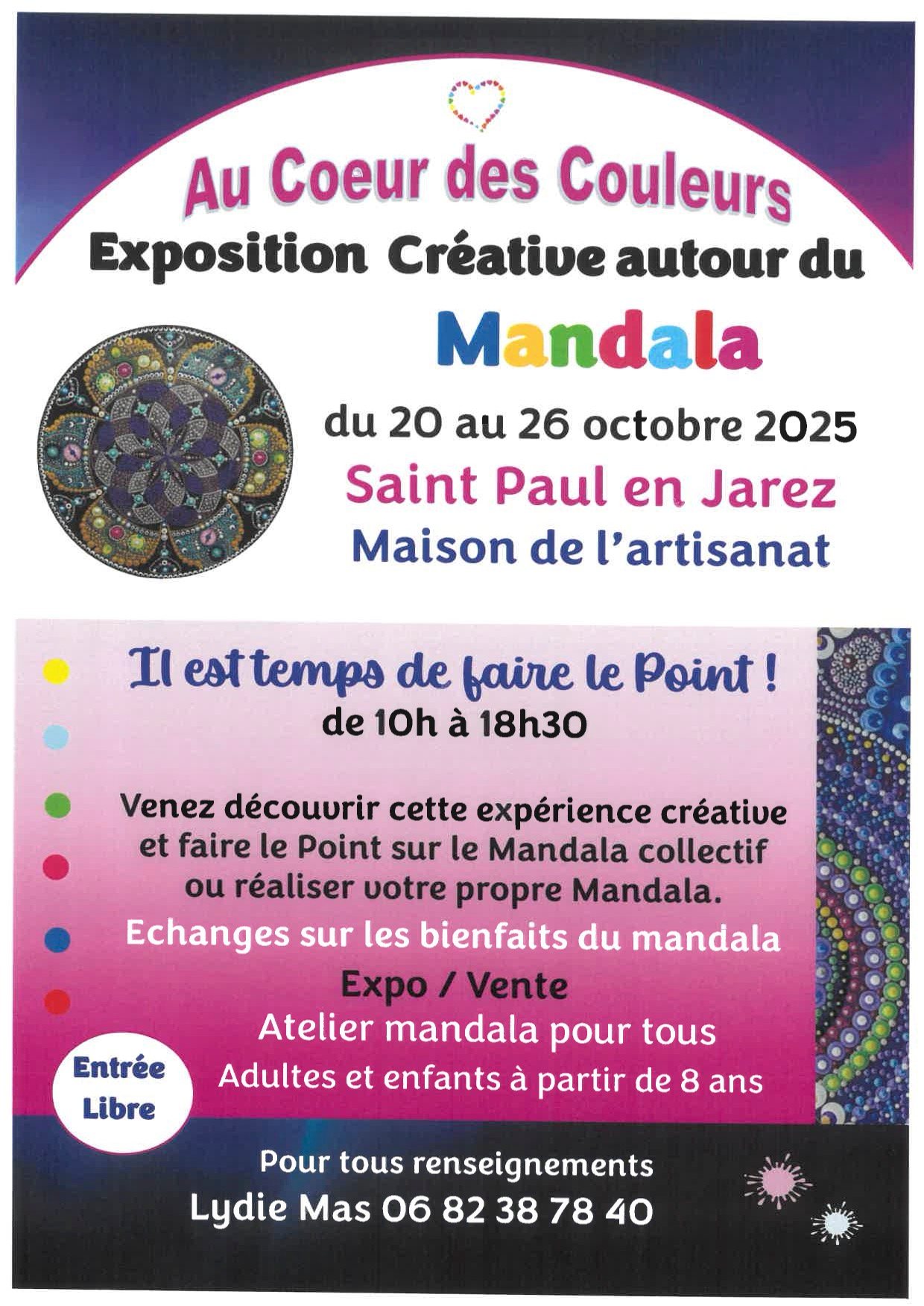 EXPOSITION CREATIVE AUTOUR DU MANDALA + Ajouter à mon Agenda Google + Exporter vers iCal Date 20 - 26 Oct 2025 En cours... Lieu Maison de l'Artisanat Partagez cet événement