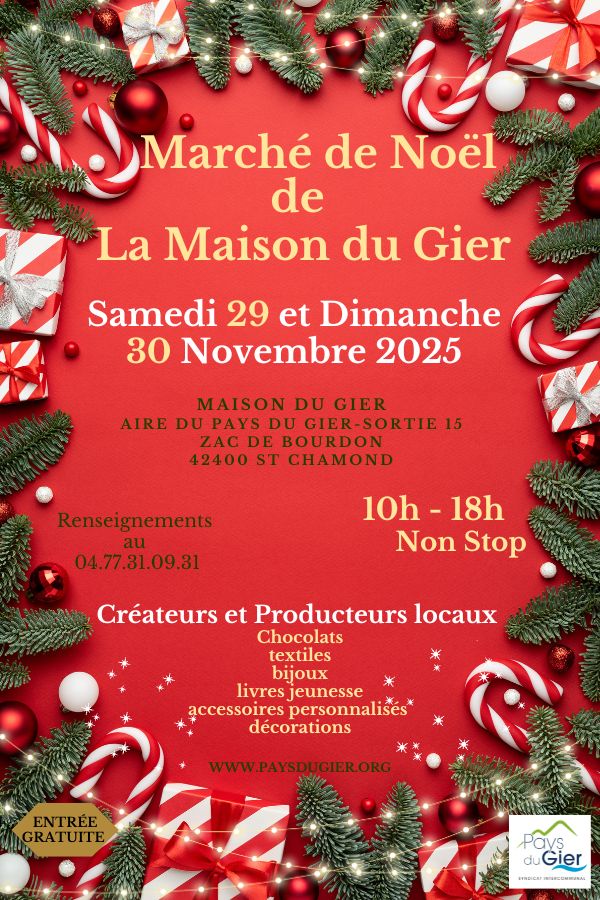 MAISON DU GIER – Marché de Noël + Ajouter à mon Agenda Google + Exporter vers iCal Date 29 - 30 Nov 2025 Heure 10h00 - 18h00 Partagez cet événement
