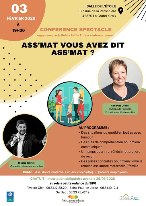 RELAIS PETITE ENFANCE INTERCOMMUNAL : CONFERENCE SPECTACLE + Ajouter à mon Agenda Google + Exporter vers iCal Date 03 Fév 2026 En cours... Partagez cet événement