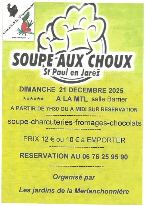 SOUPE AUX CHOUX + Ajouter à mon Agenda Google + Exporter vers iCal Date 21 Déc 2025 Lieu Maison du Temps Libre Partagez cet événement
