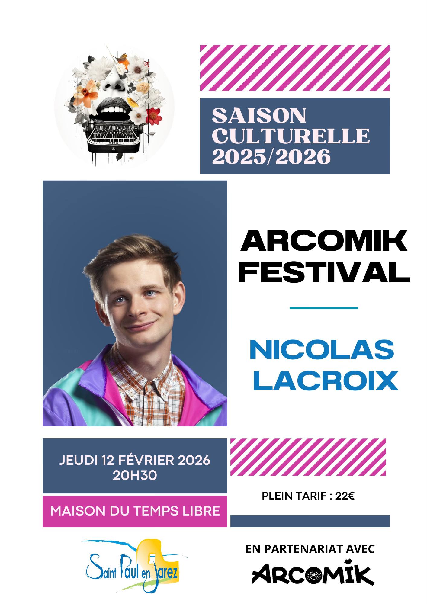 La commune de Saint-Paul-en-Jarez a le plaisir d’accueillir un temps fort dédié à l’humour dans le cadre d’ARCOMIK FESTIVAL.