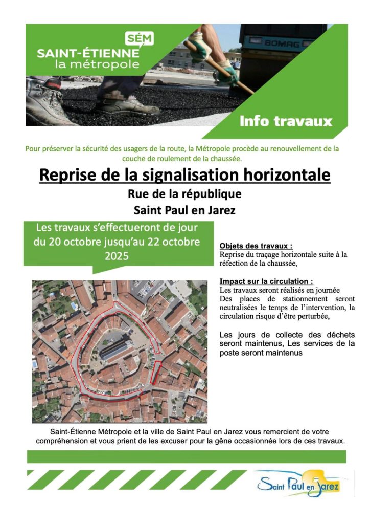 Dans le cadre de l’entretien et de l’amélioration de la voirie, des travaux de reprise de la signalisation horizontale seront réalisés du 20 au 22 octobre 2025, en journée, sur la rue de la République. Durant cette période : > Certaines places de stationnement seront temporairement neutralisées, > La circulation pourra être perturbée, > Les […]